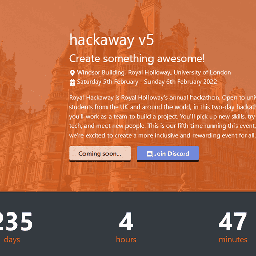 The website for Royal Hackaway, the hackathon ran by us at the Computing Society, Royal Holloway, University of London